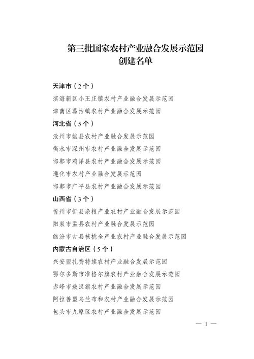 为充分发挥示范引领作用,推动农村一二三产业融合发展,促进农业增效、农民增收、农村繁荣,在各地自愿申报、省级部门推荐、第三方评审的基础上,经国家农村产业融合发展部门协同推进机制各成员单位共同研究,同意天津市滨海新区小王庄镇农村产业融合发展示范园等116个单位创建第三批国家农村产业融合发展示范园(以下简称示范园)。现将示范园创建名单予以公布,并就有关工作通知如下: